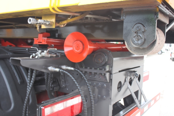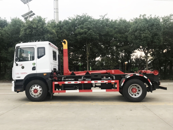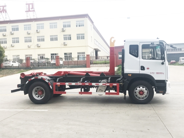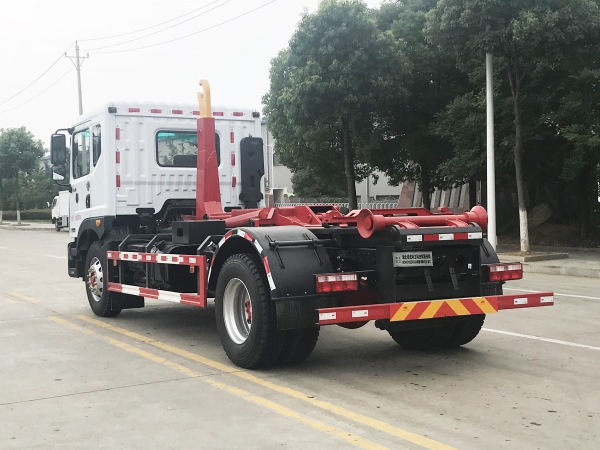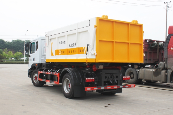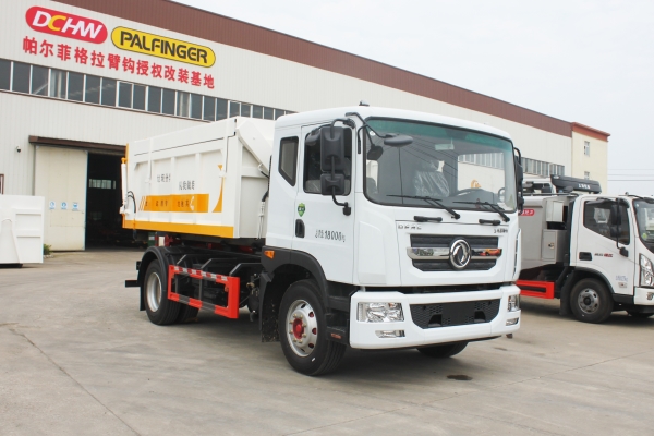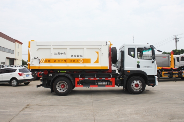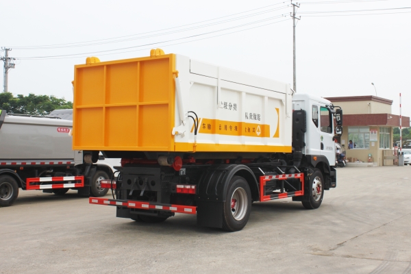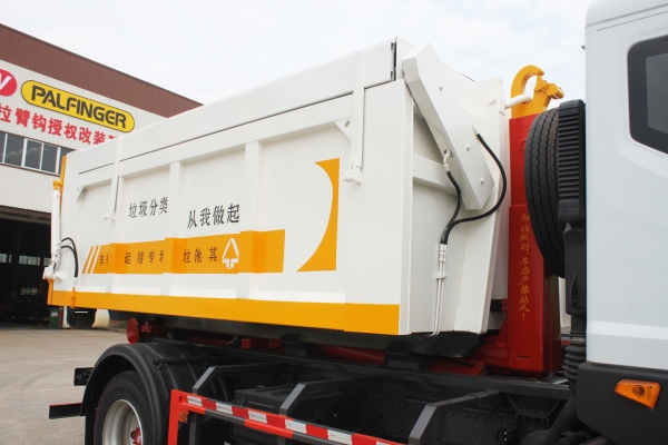 車廂可卸載式垃圾車,又稱勾臂式垃圾車、拉臂式垃圾車。該車廣泛適用與城市街道學(xué)校垃圾處理,可一車配備多個(gè)斗,各個(gè)垃圾點(diǎn)放置多個(gè),帶自卸功能,液壓操作,方便傾倒。在平日里可將車載垃圾箱放置到各個(gè)垃圾收集站,待垃圾收集滿后,該車可直接開赴至垃圾站,通過(guò)液壓系統(tǒng)的操控,可將垃圾車后座上加裝的勾臂放下,掛住站內(nèi)垃圾箱前端的連接點(diǎn),將垃圾箱拉至車體的后座上,此時(shí)即可啟動(dòng)車輛,將垃圾運(yùn)送至垃圾處理站內(nèi),進(jìn)行自卸式傾倒。該車主要的優(yōu)點(diǎn)就是可一車配多斗,一輛車就可以維持?jǐn)?shù)個(gè)垃圾收集站的運(yùn)轉(zhuǎn),效率高,且箱體為密封式設(shè)計(jì),不會(huì)造成二次污染。